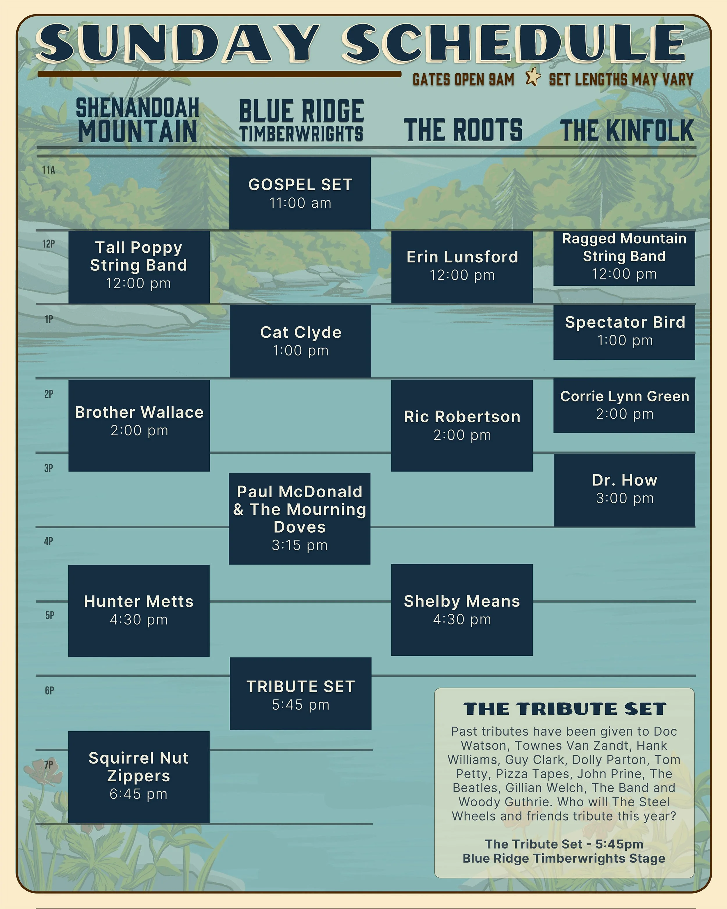 Print Schedule SHENANDOAH MOUNTAIN 12:00pm - Tall Poppy String Band2:00pm - Brother Wallace4:30pm - Hunter Metts6:45pm - Squirrel Nut Zippers Blue Ridge Timberwrights 11:00am - Gospel Set w/ The Steel Wheels1:00pm - Cat Clyde3:15pm - Paul McDonald & The Mourning Doves6:45pm - Tribute Set w/ The Steel Wheels & Friends Roots Stage 12:00pm - Erin Lunsford3:00pm - Ric Robertson4:30pm - Shelby Means Kinfolk Stage Dr How’s Local Showcase12:00pm - Ragged Mountain String Band1:00pm - Spectator Bird2:00pm - Corrie Lynn Green3:00pm - Dr. How